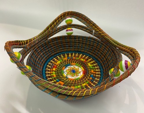 Like many artists, Dianna’s practice paused for a time due to the demands of family and work. As retirement approached, she discovered a basket weaving class at her local Senior Center. Though the techniques differed from her traditional methods—focusing on pine needle basketry instead of native practices—she embraced the new approach. She found it more accessible and just as rewarding. When the original instructor left, Dianna took the lead in continuing the class. Over the past ten years, she has grown into her role as a teacher and mentor. With the support of the internet and a growing community of fellow basket weavers, her journey continues to evolve. Her students are eager learners, each creating their own beautiful works. Through her craft, Dianna gives from the heart, and every piece she makes with her hands carries the spirit of her heritage and love. A variety of Dianna's pineneedle baskets and sculptures incorporate mixed media such as glass beads, ceramic pieces, gourds, shells, colored thread, and gemstones. They pieces along with her pineneedle jewelry are on display year-round at the Guild Gallery & Art Center.